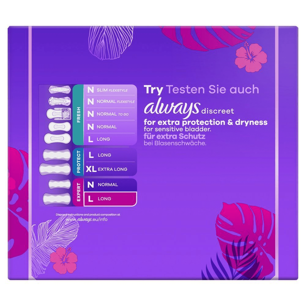 Always Expert Daily Extra Protect Long Slipeinlagen sind die Besten Always Dailies zum Schutz bei den ersten Anzeichen von Blasenschwäche. Auch bei leichter Blasenschwäche geeignet. Die Always Profresh Slipeinlagen mit geruchsneutralisierender Technologie sorgen für ein frisches und sicheres Gefühl.