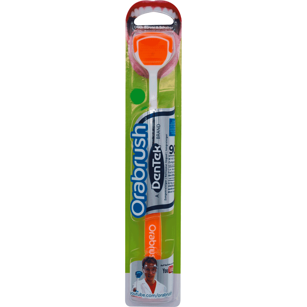 - Tiefenreinigung: 90% des schlechten Atems werden durch Zungenbelag verursacht. Die Orabrush sorgt für eine tiefenwirksame Entfernung von Bakterien auf der Zunge.