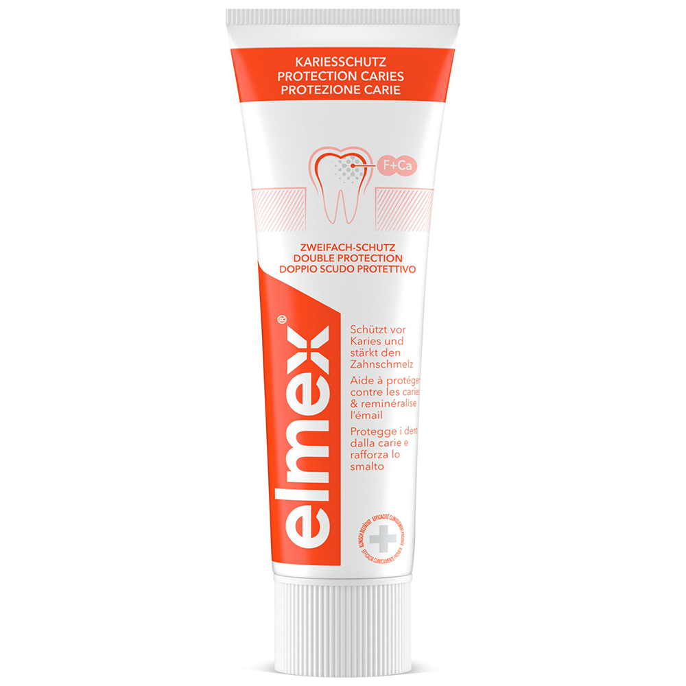 Stärkt die Zähne mit Mineralien für geschwächten Zahnschmelz und schützt so gegen Karies. Wie entsteht Karies? Zucker in Lebensmitteln führt zum Verlust von Mineralien in unseren Zähnen, wodurch Karies entstehen kann. Karies entsteht nicht über Nacht, sondern entwickelt sich über einen längeren Zeitraum hinweg. Im Anfangsstadium kann dieser Prozess noch aufgehalten und umgekehrt werden. Wie kann elmex® Kariesschutz Zahnpasta mit Neo-Aminex™ Technologie helfen? elmex® KARIESSCHUTZ mit Neo-Aminex™ Technologie wurde speziell zum Schutz gegen Karies entwickelt. Durch die Bildung einer homogenen und widerstandsfähigen Schutzschicht, remineralisiert sie die Zähne und hilft einen Mineralienverlust zu verringern. Dies führt zur Stärkung des Zahnschmelzes und macht die Zähne widerstandsfähiger gegen Karies. Vegane Formel und recycelbare Tube