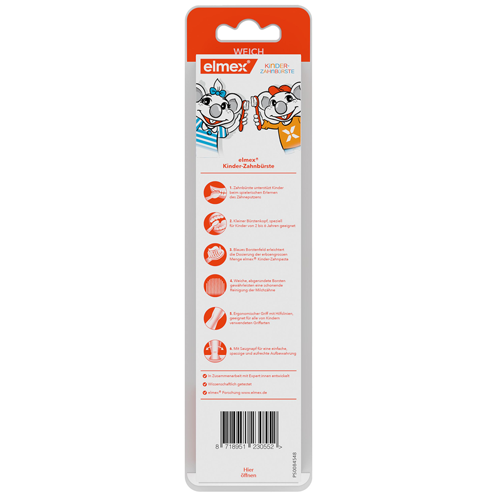 Die elmex Kinder-Zahnbürste unterstützt Kinder beim spielerischen Erlernen des Zähneputzens. Kleiner Bürstenkopf speziell angepasst an den Mund von Kindern von 2-6 Jahren. Ein blaues Borstenfeld erleichtert die Dosierung der erbsengrossen Menge Kinder-Zahnpasta. Weiche, abgerundete Borsten gewährleisten eine schonende Reinigung der Milchzähne. Ergonomisch geformter Griff mit Führungslinien geeignet für alle von Kindern verwendeten Griffarten. Mit Saugnapf für eine einfache, spaßige und aufrechte Aufbewahrung.