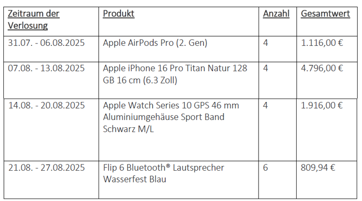 (14) Aus allen Registrierungen werden die Gewinner der Hauptpreise mittels Zufallsgenerator unter Ausschluss der Öffentlichkeit ausgewählt. Die Ziehung erfolgt am 28.08.2025.