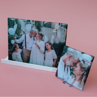 Personalisierte Fotogeschenke wie Tassen, Puzzles & Schneekugeln mit Familienfotos auf rosa Hintergrund