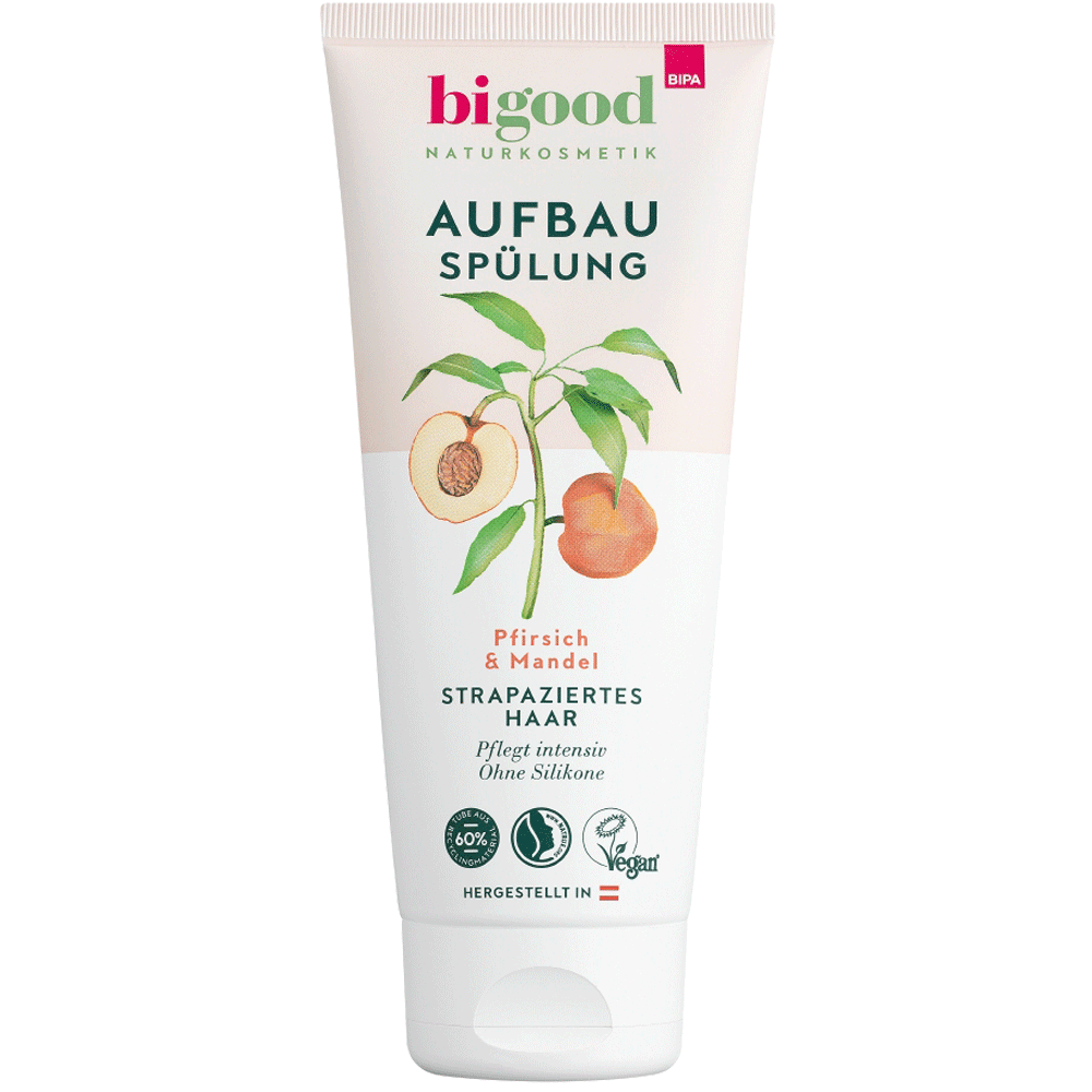 So macht die Natur wieder gut, was Ihr Haar strapaziert: bi good Aufbau Shampoo Pfirsich mit natürlichen Inhaltsstoffen reinigt sprödes, strapaziertes Haar sanft, ohne es noch mehr auszutrocknen. Die Formulierung aus wertvollem Pfirsich- und BIO-Mandelextrakt und schonenden pflanzlichen Tensiden pflegt auch die Kopfhaut intensiv und spendet Feuchtigkeit. Nährende Weizenproteine und BIO-Aloe Vera sorgen für natürlichen Seidenglanz. Natürlich wäre unsere Aufbau Spülung Pfirsich mit BIO-Mandelöl jetzt noch Balsam für das Haar!