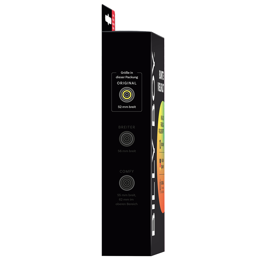 Billy Boy Bunte Vielfalt Kondome sind vegan, dermatologisch getestet und 100% elektronisch geprüft. Je 3 rote und schwarze Kondome (glatt), 2 grüne Kondome (glatt) plus 2 transparente, naturfarbene Kondome mit Perlnoppen. Wandstärke ca. 0,1 mm. Kondome hergestellt aus Naturkautschuk mit Gleitfilm, Reservoir und leichtem Duft. Gerade, zylindrische Form mit Breite (flachliegend) von 52 mm.