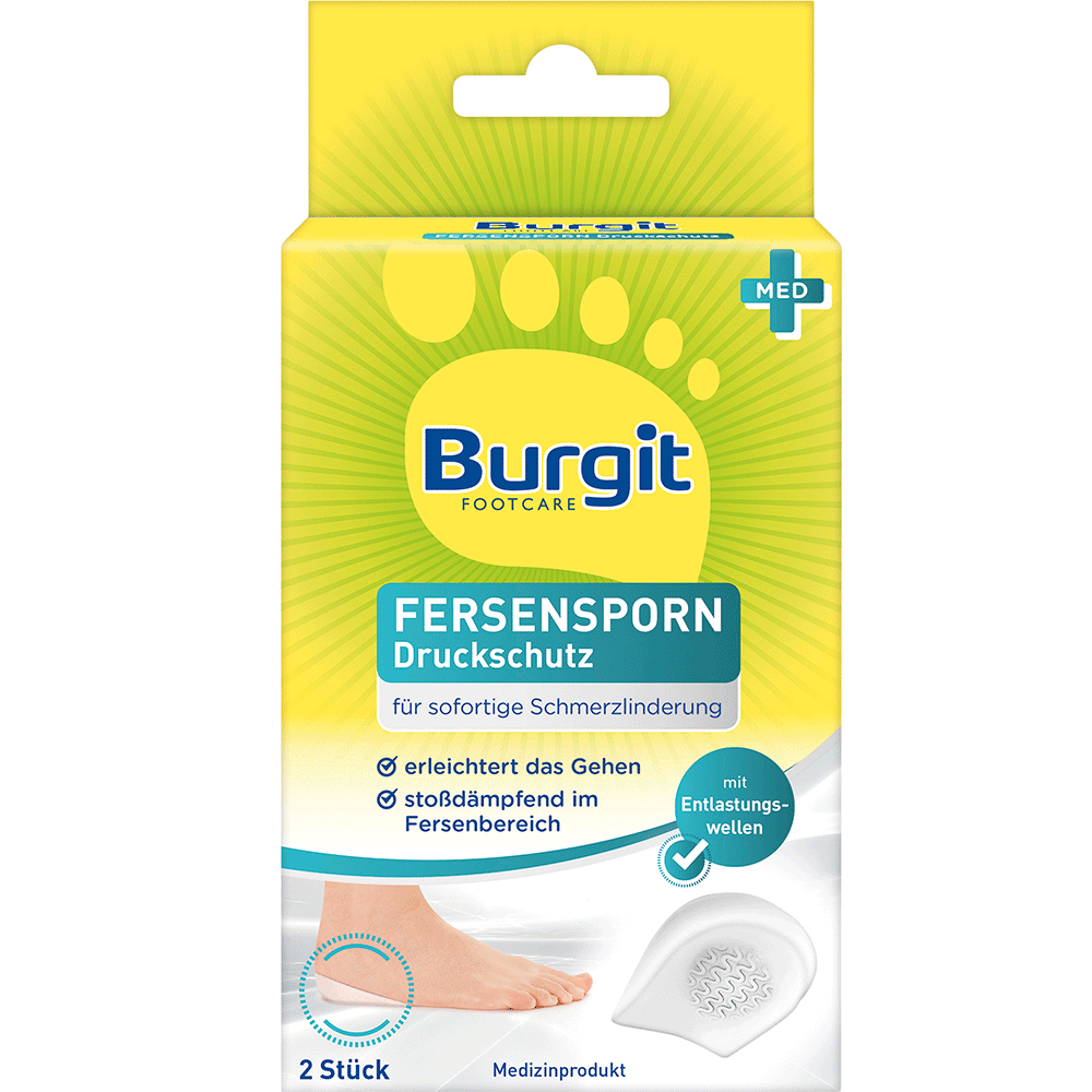 Jeder Schritt schmerzt. Ein unangenhmer Fersensporn hat sich gebildet, und es kann noch dauern, bis er fertig behandelt ist. Für die Zeit bis dahin federt der Burgit Fersensporn Druckschutz die schlimmsten Schmerzspitzen mit weichen Gel-Sohlen plus integrierten Entlastungswellen ab und unterstützt ein schmerzfreieres Gangbild. Wohltuende Druckentlastung bei jedem Schritt.