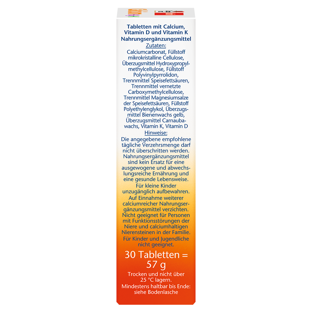 Zutaten:Zutaten: Calciumcarbonat, Reisstärke, Füllstoff Gummi arabicum; Füllstoffe Cellulose, Überzugsmittel Hydroxypropylmethylcellulose, Trennmittel Magnesiumsalze der Speisefettsäuren, Farbstoff Titandioxid, Überzugsmittel Schellack, Füllstoff vernetzte Natrium-Carboxymethylcellulose, Trennmittel Talkum, Olivenöl, Emulgator Polysorbat 80, Phytomenadion, Cholecalciferol