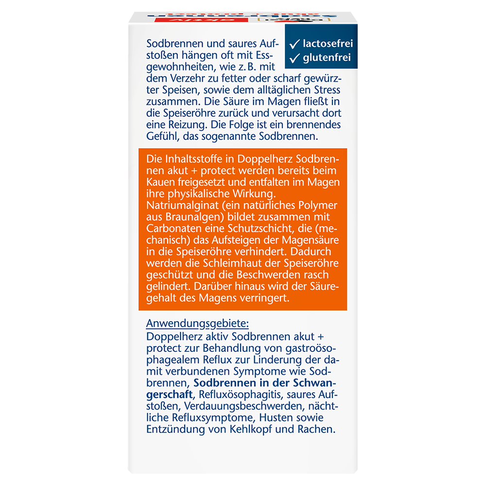 Doppelherz Sodbrennen akut + protect Kautabletten basieren auf Natriumalginat und Carbonaten. Die Inhaltsstoffe werden bereits beim Kauen freigesetzt und entfalten im Magen ihre physikalische Wirkung.
