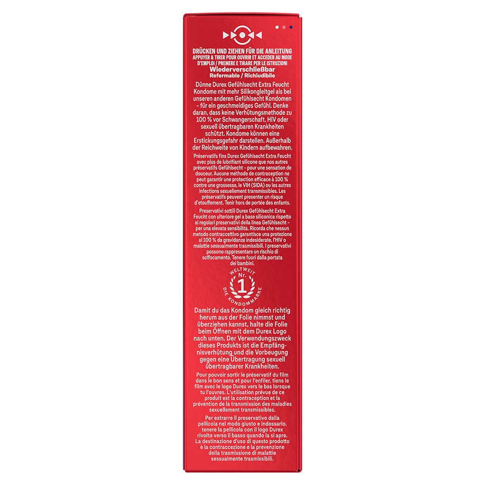 Beschreibung:Die Durex Gefühlsecht Extra Feucht Kondome (10 Stück) haben eine nominale Breite von 56 mm (Länge: 195 mm), sind dünn für intensives Empfinden und extra befeuchtet für eine verbesserte Gleitfähigkeit. Durch ihre anatomische Passform haben sie einen besonders komfortablen Sitz. Dank unseres Herstellungsverfahrens riechen die Kondome außerdem angenehm. Kennst du deine nominale Breite? Damit ihr auch immer gut geschützt seid, ist es wichtig, die richtige Kondomgröße zu verwenden. Ein zu großes Kondom kann abrutschen, ein zu kleines Kondom kann platzen. Denn jeder Mensch ist anders, aber ein Kondom sollte für alle stets bequem und vor allem sicher sein. Die Durex Gefühlsecht Extra Feucht Kondome haben eine nominale Breite von 56 mm, eine glatte, anatomische Form mit Reservoir, sind transparent und extra stark befeuchtet mit Silikongleitgel für eine verbesserte Gleitfähigkeit.Sofort startklar: Wir sorgen dafür, dass jedes Kondom in jeder einzelnen Folie immer gleich herum liegt. Dabei dient das Durex Logo auf der Folie als Orientierung. Damit du also das Kondom immer direkt richtig herum aus der Folie nimmst, halte die Folie beim Öffnen mit dem Durex Logo nach unten und entnimm das Kondom. Durex - DIE KONDOMMARKE NR.1 Wir stehen für echten, sich gut anfühlenden und befriedigenden Sex - überall und zu jeder Zeit. Deshalb vertrauen uns Millionen Konsumenten weltweit jeden Tag seit über 90 Jahren. Also, wie auch immer du heute noch Sex haben willst, denke an den richtigen Schutz.