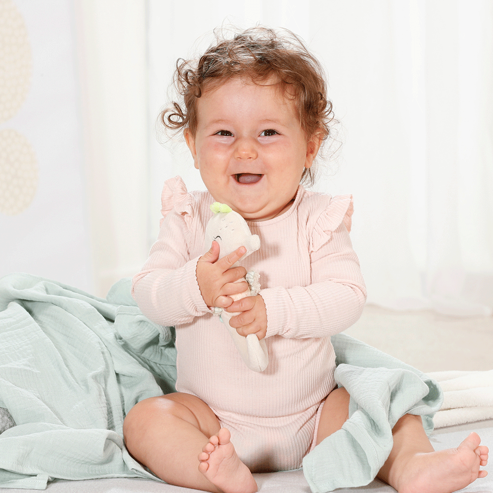 Das Stabgreifling-Seepferd ist perfekt für kleine Babyhände, weckt mit der verborgenen Rassel Babys Neugier und lädt zum Spielen, Entdecken und Forschen ein. Im Set enthalten sind außerdem zwei große Baumwolle-Musselintücher 60 x 60 cm in Seegrün, von denen Mama mit Baby niemals genug besitzen kann.
