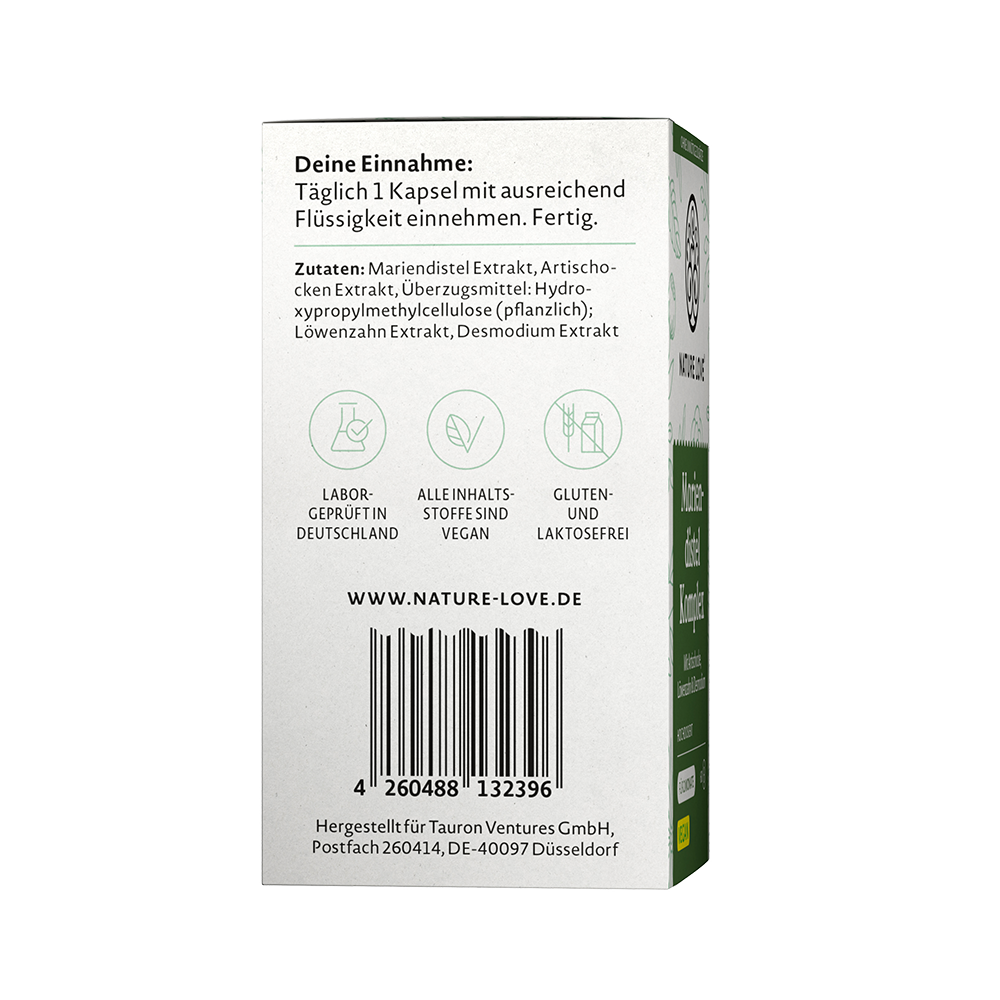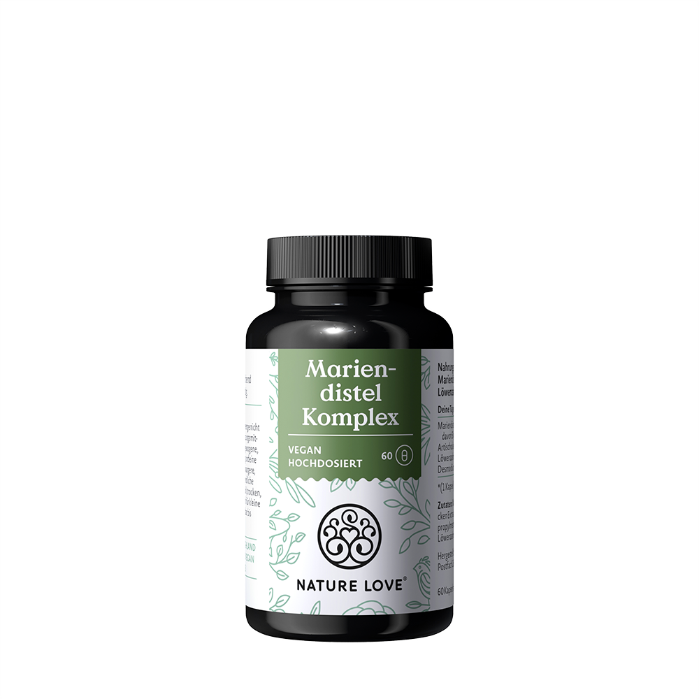 Unsere Pflanzenwelt ist einfach großartig! Pflanzen enthalten nämlich von Natur aus sekundäre Pflanzenstoffe, die sie vor der Umwelt schützen und dadurch auch traditionell eingesetzt werden. Die Mariendistel ist unter anderem für den Pflanzenstoff Silymarin bekannt und beliebt. Davon gibt's in dem Mariendistel-Komplex stolze 80%. Das 4-fach Komplex wird abgerundet durch Extrakte aus Löwenzahn, Desmodium und Artischocke. Bei Nature Love ist eines ganz besonders wichtig: Natürlichkeit. Deswegen stellen wir die Produkte mit größter Achtsamkeit und wann immer möglich aus natürlichen, rein pflanzlichen Quellen her.