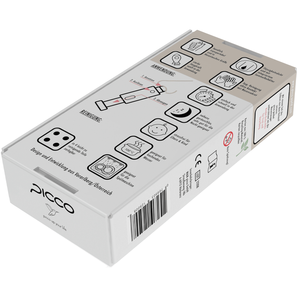 Die Anwendung mit kontrollierter Saugkraft erfolgt beinahe geräuschlos und somit stressfrei für Eltern und Babies. Dank des innenliegenden Sammelbehälters und dem Deckel, kann der picco pocket Nasensauger immer und überall mit dabei sein.