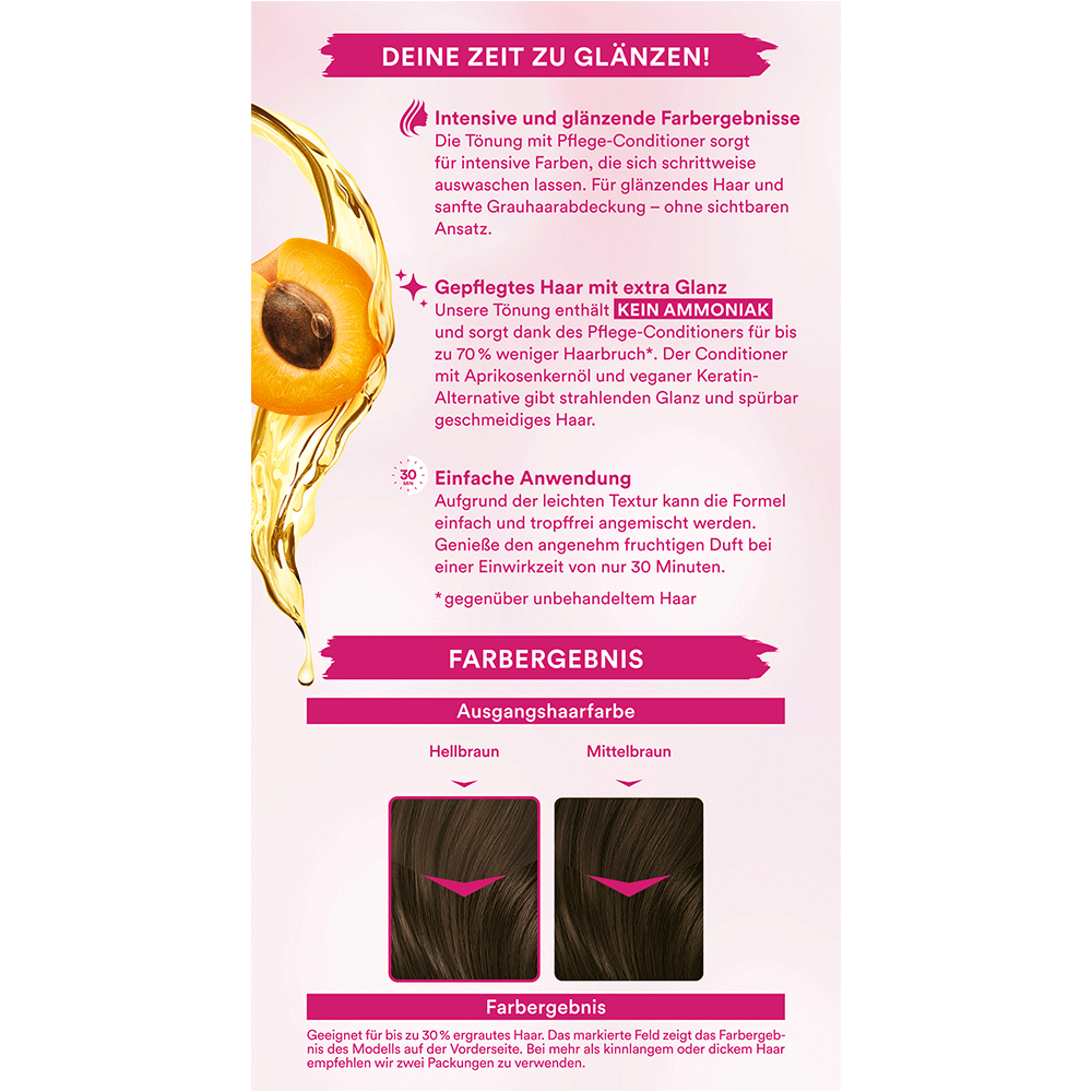 - Die Haartönung mit sanfter Formel ohne Ammoniak sorgt für eine schonende Grauhaarabdeckung und bis zu 70 % weniger Haarbruch