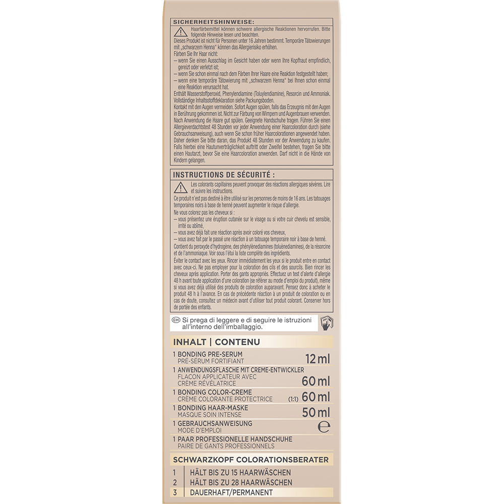 Die Formel der permanenten Coloration mit 3x Bonding HaptIQ System schützt vor, während und nach der Coloration vor sichtbaren Haarschäden und sorgt für intensive & gleichmäßige Farbergebnisse mit 100 % Grababdeckung.