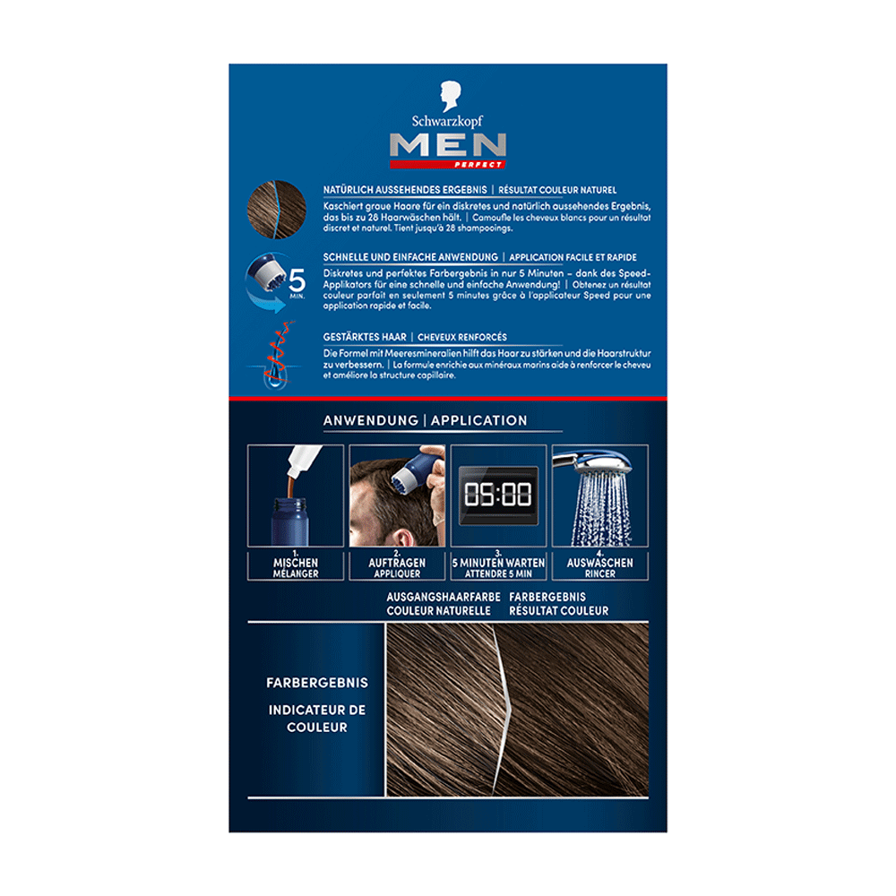 Beschreibung:SCHWARZKOPF MEN Perfect Anti-Grau Tönungs-Gel - Für eine natürlich aussehende Graukaschierung in nur 5 MinutenSCHWARZKOPF MEN Perfect Anti-Grau Tönungs-Gel ist eine Coloration, die speziell für Männer entwickelt wurde. Das MEN Perfect Anti-Grau Tönungs-Gel kaschiert graue Haare in nur 5 Minuten und sorgt für ein diskretes und natürlich aussehendes Ergebnis. Der Speed-Applikator verspricht eine schnelle und leichte Anwendung und das Ergebnis hält bis zu 28 Haarwäschen. Die Formel mit Meeresmineralien hilft, Ihr Haar beim Haare färben zu stärken und die Haarstruktur zu verbessern. Das MEN Perfect Anti-Grau Tönungs-Gel ist in 7 verschiedenen Nuancen erhältlich: 30 Mittelblond, 40 Dunkelblond, 50 Hellbraun, 60 Mittelbraun, 70 Dunkelbraun, 80 Schwarzbraun und 90 Schwarz. Die Produktvorteile im Detail: Speziell für Männer entwickelt Kaschiert graue Haare in 5 Minuten Schnelle & einfache Anwendung dank Speed-Applikator Natürlich aussehendes Ergebnis Hält bis zu 28 Haarwäschen Formel mit Meeresmineralien Hilft, das Haar zu stärken und die Haarstruktur zu verbessern Anwendung: 1. Mischen Sie die Entwicklerlotion mit dem Tönungs-Gel und schütteln Sie die Anwendungsflasche so lange kräftig, bis der Inhalt vollständig vermischt ist. 2. Beginnen Sie sofort mit der Anwendung und tragen Sie die Colorationsmischung mit Hilfe des Speed-Applikators auf dem trocknen, nicht vorgewaschenen Haar auf. 3. Die Einwirkzeit beginnt, wenn die Anwendung abgeschlossen ist. Für erste ergraute Haare lassen Sie die Mischung 5 Minuten einwirken. 4. Nach Ablauf der Einwirkzeit schäumen Sie Ihr Haar mit lauwarmem Wasser auf und spülen es danach gründlich aus. Waschen Sie anschließend Ihr Haar mit einem milden Shampoo.Die Einwirkzeit und das Farbergebnis hängen von Ihrem Grauhaaranteil ab. Für eine natürlich aussehende und diskrete Graukaschierung empfehlen wir eine Einwirkzeit von 5 Minuten. Für eine intensivere Grauhaarkaschierung empfehlen wir eine Einwirkzeit von bis zu 10 Minuten.