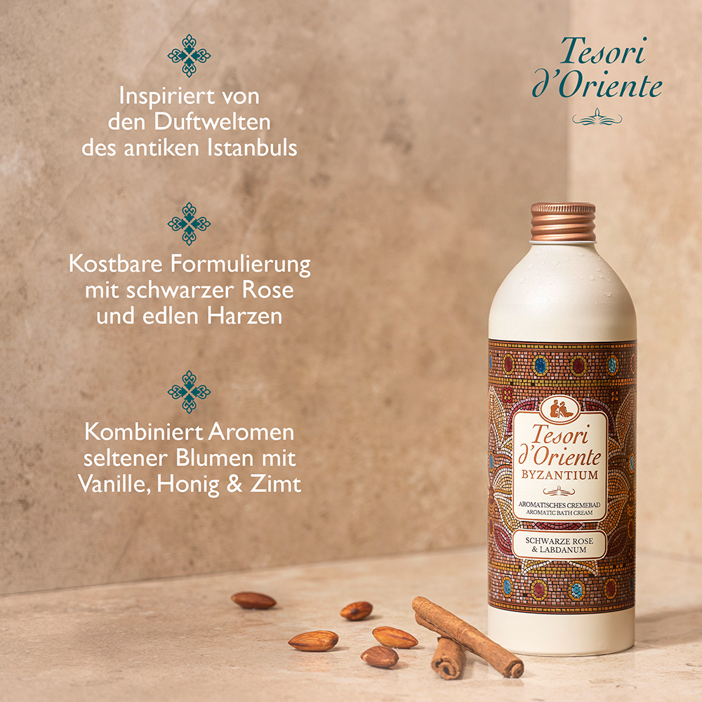 Das Byzantium-Cremebad ist inspiriert von einer imaginären Reise in die antike Stadt Byzanz, dessen majestätische, goldene Paläste von himmlischen Düften seltener Blumen und kostbarer Harze durchdrungen wurden. Die Kombination aus schwarzer Rose und Labdanum sorgt für ein sinnliches Bade-Erlebnis und verleiht der Haut dabei mit sanft pflegenden Eigenschaften ein Gefühl der Weichheit und Geschmeidigkeit.