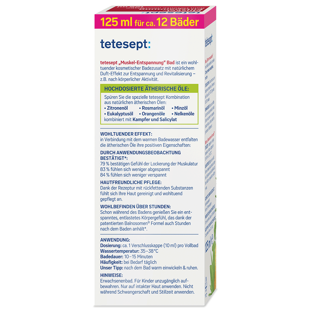 Beschreibung:tetesept Muskel Entspannung Bad ist ein wohltuender kosmetischer Badezusatz mit natürlicher Duft-Effekt zur Entspannung und Revitalisierung - zB nach körperlicher Aktivität. In Verbindung mit dem warmen Badewasser entfalten die ätherischen Öle ihre positiven Eigenschaften. Mit hochdosierten, natürlichen ätherischen Ölen von Rosmarin,Minze, Zitrone und Eukalyptus sowie Kampfer und Salicylat. Schon während des Badens genießen Sie ein entspanntes, entlastetes Körpergefühl, das dank der patentierten Balnosomen® Formel auch Stunden nach dem Baden anhält.