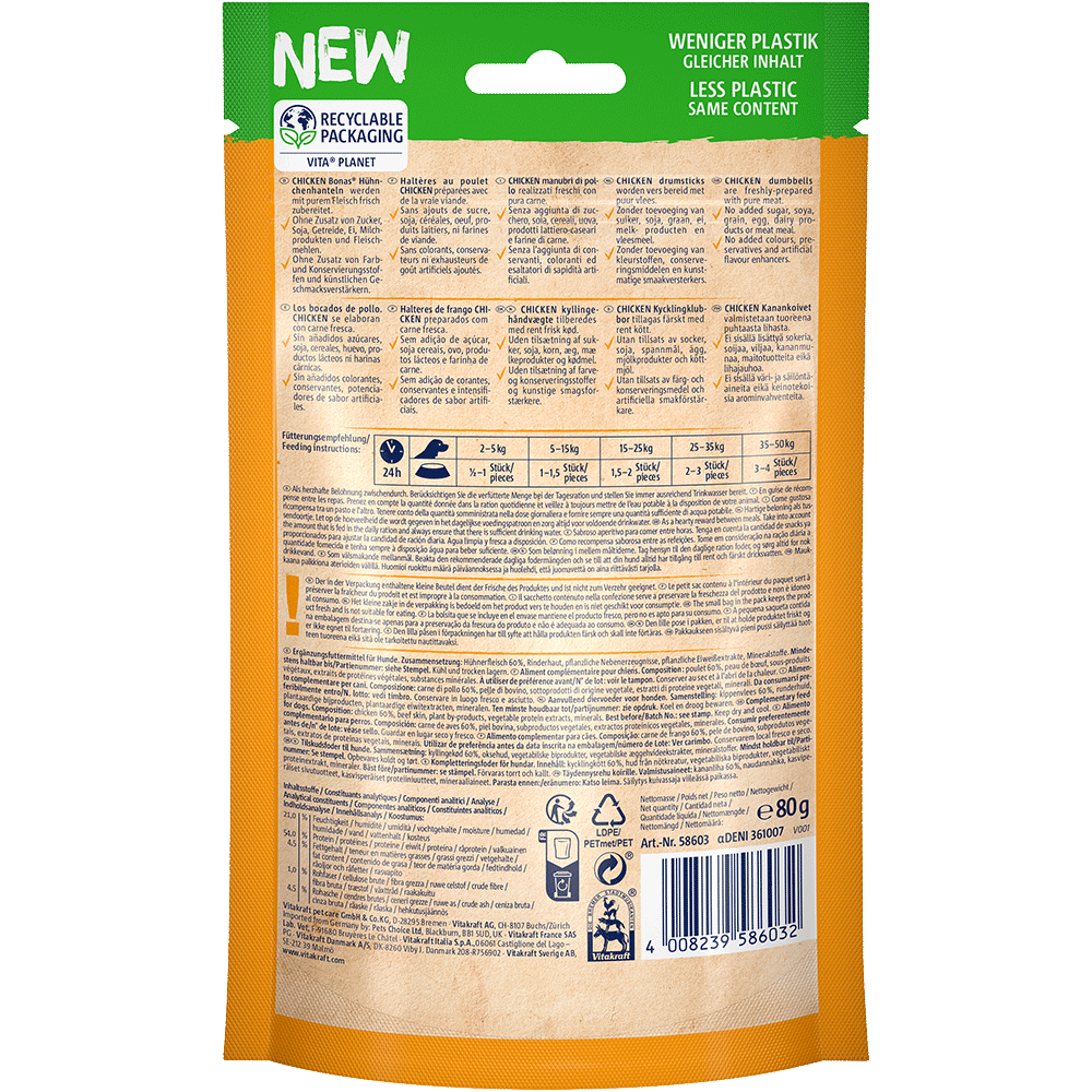 Die hochwertigen Hühnchenhanteln schmecken einfach fantastisch und sind ideal als artgerechte Belohnung. Die schmackhaften Rinderhaut-Snacks werden mit purem Hühnchenfleisch frisch zubereitet – ohne Zusatz von Zucker, Soja, Getreide, Ei, Milchprodukten und Fleischmehlen. Auch auf alle Zusatzstoffe, von Konservierungsmitteln bis hin zu Geschmacksverstärkern, wird bei der Herstellung konsequent verzichtet. Für den Hund bedeutet das herzhaften Kauspaß in bester Qualität!