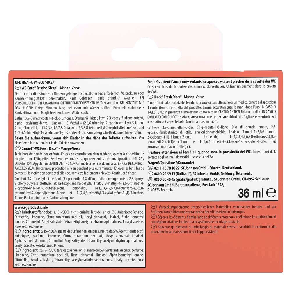 Verwendungshinweis:Bitte stellen Sie sicher, dass die Toilette sauber ist. 1.Einrasten. Den Gelbehälter in den blauen Spendergriff schieben, bis der Druckknopf mit einem KLICK im ersten Loch einrastet. Verschlusskappe abnehmen & aufbewahren. 2.Platzieren. Den Spender mit dem offenen Ende dort an der Innenwand des WC-Beckens platzieren, wo das Wasser beim Spülvorgang entlang fließt. 3.Anbringen. Den Druckknopf drücken und gleichzeitig den blauen Spendergriff in Richtung des WC-Beckens schieben, bis der Druckknopf im nächsten Loch einrastet. 4.Abziehen. Den Spender einfach abziehen und das WC-Ente Frische-Siegel haftet im WC-Becken. Spender wieder verschließen. Kann nach dem Anbringen im WC-Becken auf Kinder anziehend wirken. Produkt an einer Stelle anbringen, die für Kinder am wenigsten sichtbar ist. Toilettenspülung benutzen, um das WC-Ente Frische-Siegel zu aktivieren. 5.Nachfüllen. Nach dem Anbringen des letzten WC-Ente Frische-Siegels den Gel-Behälter leicht drehen und vom Spendergriff